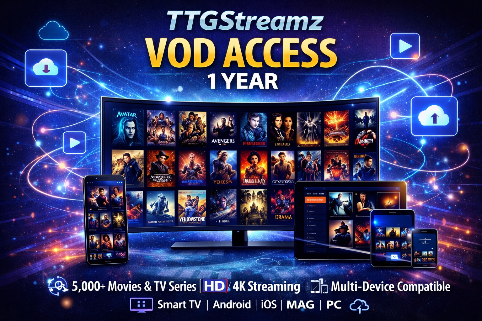 Unlock thousands of on-demand movies and TV shows with TTGStreamz VOD Access. Perfect for home entertainment or enhancing your IPTV experience with premium content.